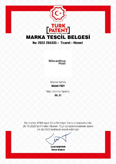 "Miscanthus Pelet" ismi 4 ve 31'nci sınıf kapsamında marka olarak korunmakta.